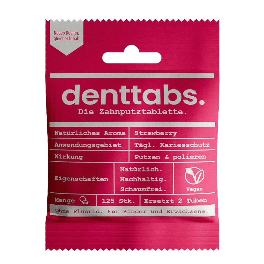 Når tabletten tygges, opløses den hurtigt og danner en blid tandpasta, som rengør tænderne effektivt uden at ridse emaljen. Denttabs er udviklet i samarbejde med tandlæger og indeholder nøje udvalgte ingredienser, der understøtter en sund mundhygiejne – helt uden unødvendige tilsætningsstoffer.